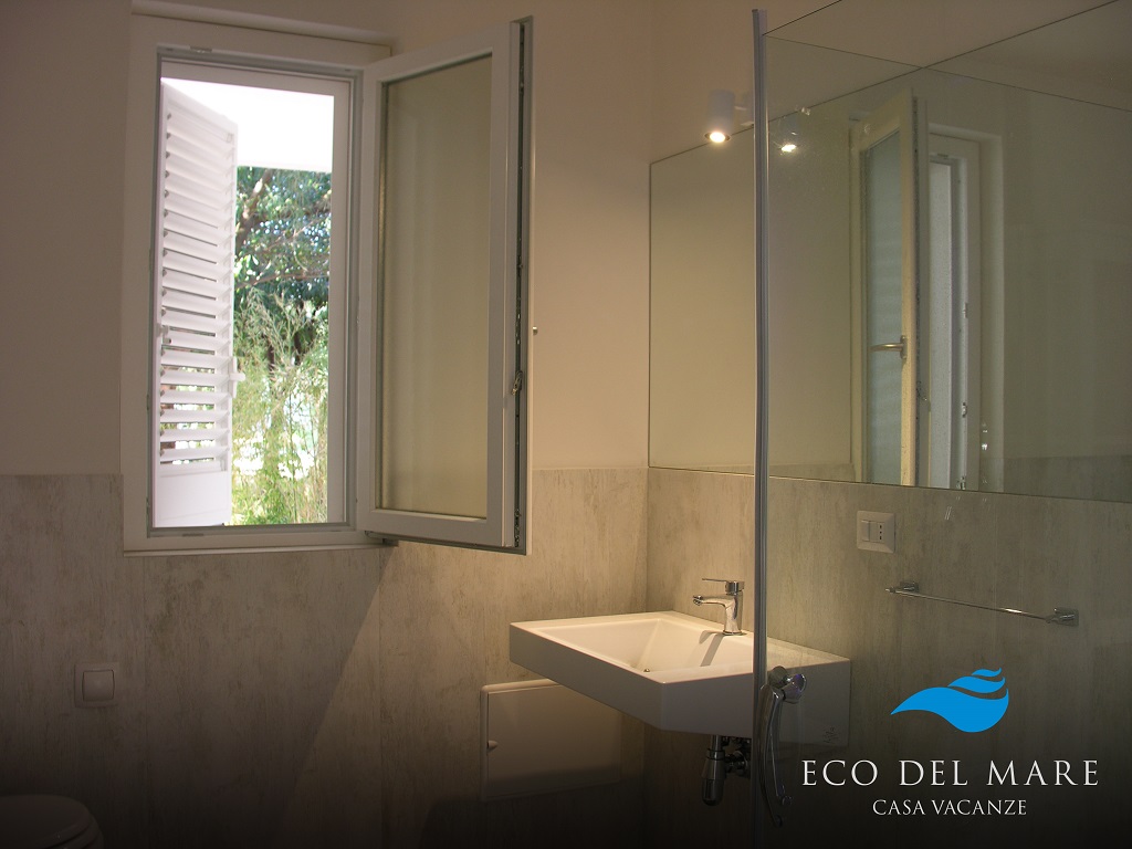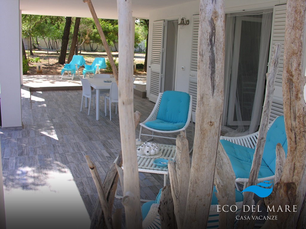Appartamento spazioso e luminoso con esposizione al sorgere del sole, ubicato di fronte ad ampio giardino di pertinenza, in posizione riservata e particolarmente riparata dai venti predominanti. Esso è composto da una camera da letto matrimoniale, un ampio soggiorno-cucina munito di divano letto, un bagno con box doccia in cristallo con pannello doccia per idromassaggio e cromoterapia, un’ampia veranda coperta arredata con divanetti, tavolo con sedie per la zona pranzo, sdraio e lettini prendisole.